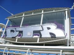 Graffiti Tags being removed from commentator glass booth by G.R.S