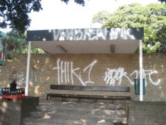 Paint being stripped, before removing underlying Graffiti from face brick.