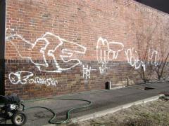 Graffiti Tags and cream PVA paint being stripped by G.R.S
